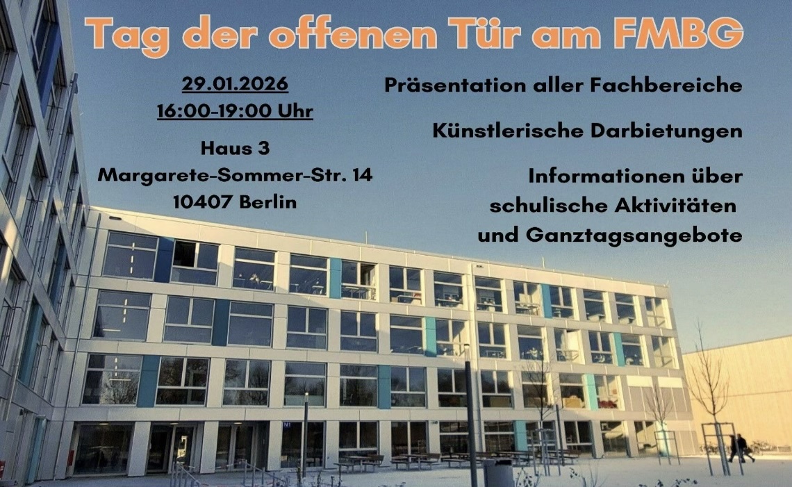 Zum Tag der offenen Tür präsentiert sich unsere Schule auf drei Etagen in allen Fachbereichen. Die Schülerinnen und Schüler werden unsere Gäste willkommen heißen und durch das Haus führen. Die Lehrerinnen und Lehrer geben einen Einblick in den Schulalltag des Felix-Mendelssohn-Bartholdy-Gymnasiums, informieren über die vielfältigen Unterrichtsangebote in der Sekundarstufe I und II und über die Fülle von Aktivitäten außerhalb des Stundenplanes.
