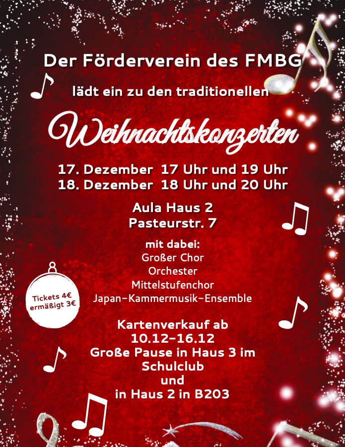 Am Donnerstag, den 18.12.2025 verzaubert Sie um 18:00 Uhr und um 20:00 Uhr der große Chor mit unserem Orchester, das Japan-Kammermusikensembles und die beiden Musikleistungskurse. Eintrittskarten können Sie ab Mittwoch, dem 10.12.2025 in Haus 3 in den großen Pausen im Schulclub und in Haus 2 in Raum B 203 zu einem Preis von 3€ (ermäßigt) und 4€ erwerben.